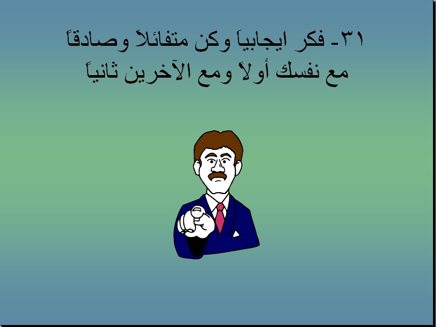 إن تموت واقفًا أفضل من أن تعيش تحت الأقدام !! الابتسامة كلمة طيبة من غير حروف !! الابتسامة لا تكلف شيئا ولكنها تعني الكثير ! الابتسامة هي جواز السفر إلى القلوب !! قد تندم لحظة إذا سئلت ولكنك ستندم طول عمرك إذا لم تسأل !! إذا اخترت الحياة على الهامش فـ أعلم إنك ستموت بدون عنوان !! اندم كما شئت فـ رصيد ندمك في بنك الحياة لن ينتهي !! لا تدع قطار حياتك يتوقف كثيرًا على " مـحـطـة " اليأس واحتفظ دومًا بـ " تـذكـرهـ " الأمل ! الإنسان بدون أمل كـ الوردة بدون ماء فـ بدونه قد تموت قبل أن تجد من ينقذها !! قد يضيع الحب وقد نفتقد الأمل ولكن تبقى لنا الذكرى !! الضعف .. أن تكون أداهـ في أيدي الآخرين !!